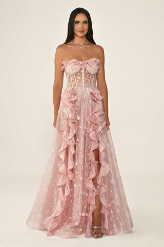 Alfa Beta Alfa Beta Kadın Straplez Yaka Tüy Detaylı Dökümlü Yırtmaçlı Pembe Abiye & Mezuniyet Elbisesi AB7131-PEMBE