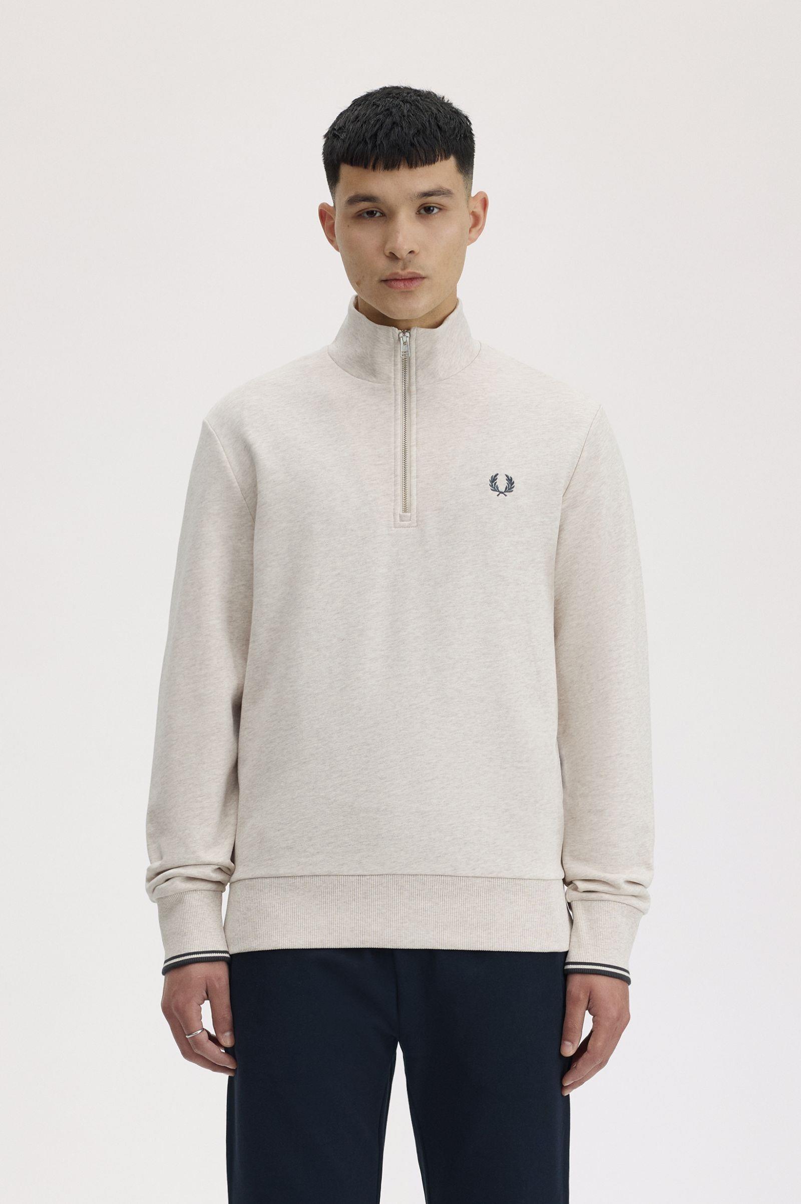 Fred Perry Erkek Normal Kalıp Yarım Fermuarlı Dik Yaka %100 Pamuklu Logo İşlemeli Uzun Kollu Ekru Sweatshirt M3574-W50 (M3574-W50)