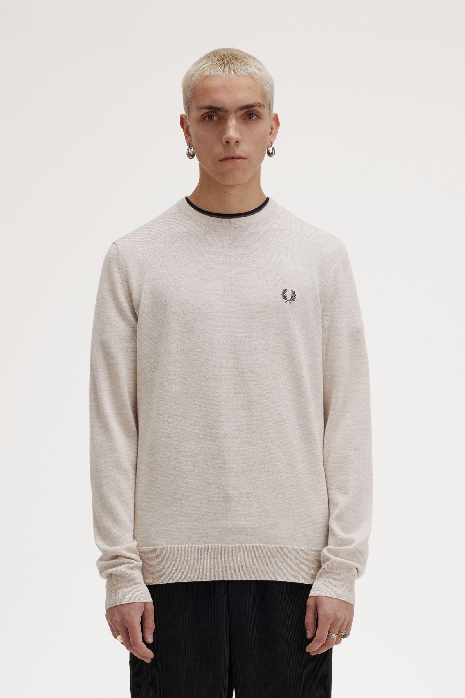 Fred Perry Erkek Normal Kalıp Yuvarlak Yakalı Yün ve Pamuk Karışımlı Uzun Kollu Ekru Sweatshirt K9601-X23 (K9601-X23)