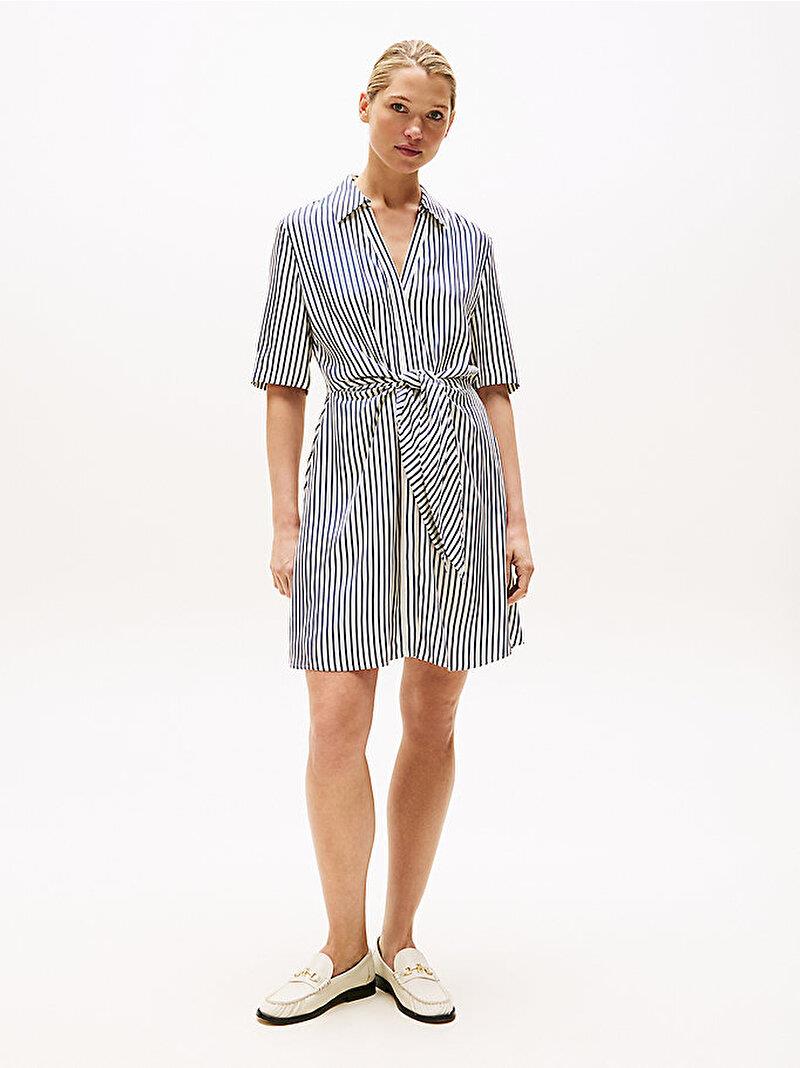 Tommy Hilfiger Kadın Rahat Kalıp Çizgili Desenli Gömlek Yaka Kısa Kollu Beyaz Elbise WW0WW45820-0FD (WW0WW45820-0FD)